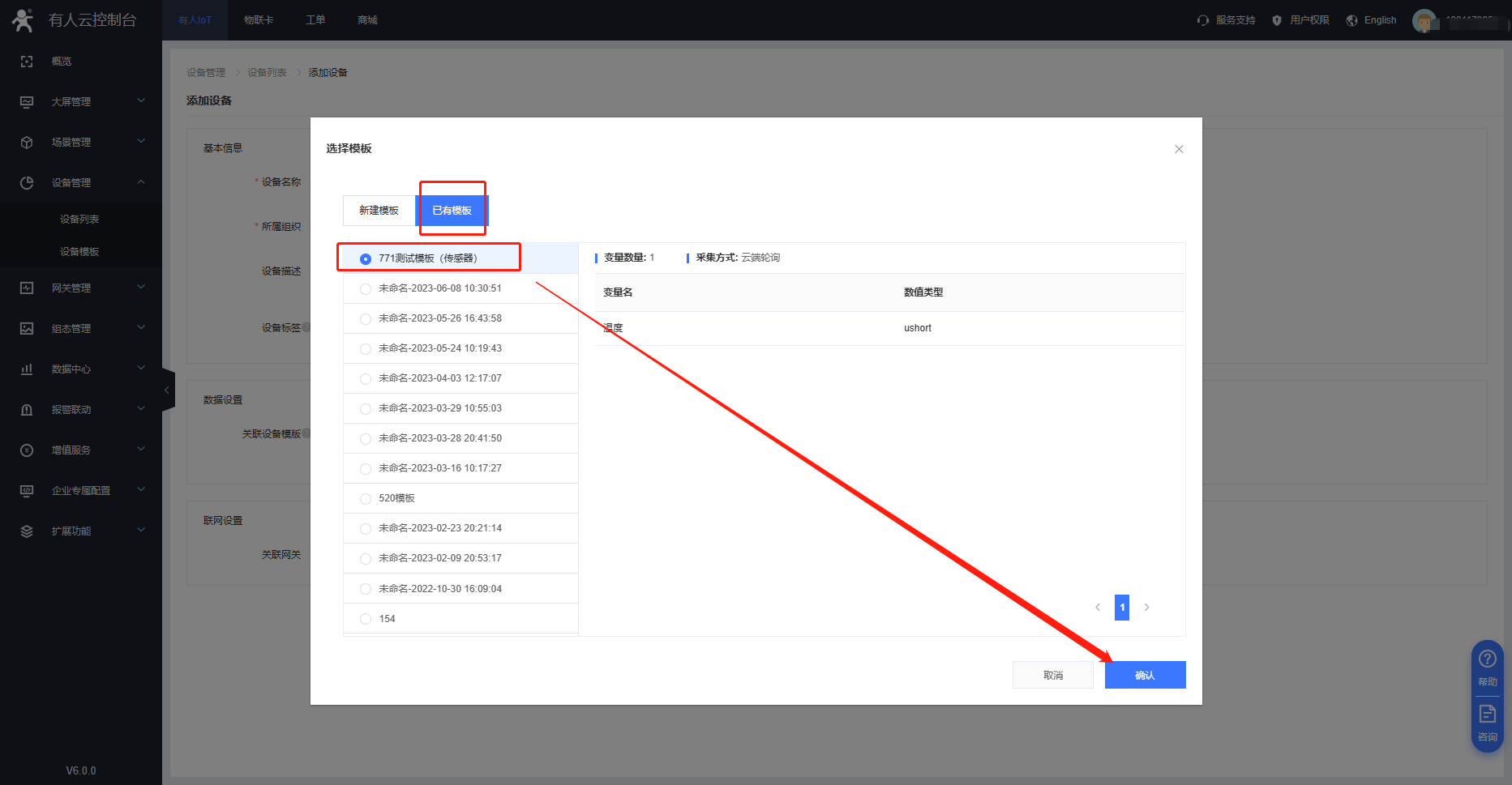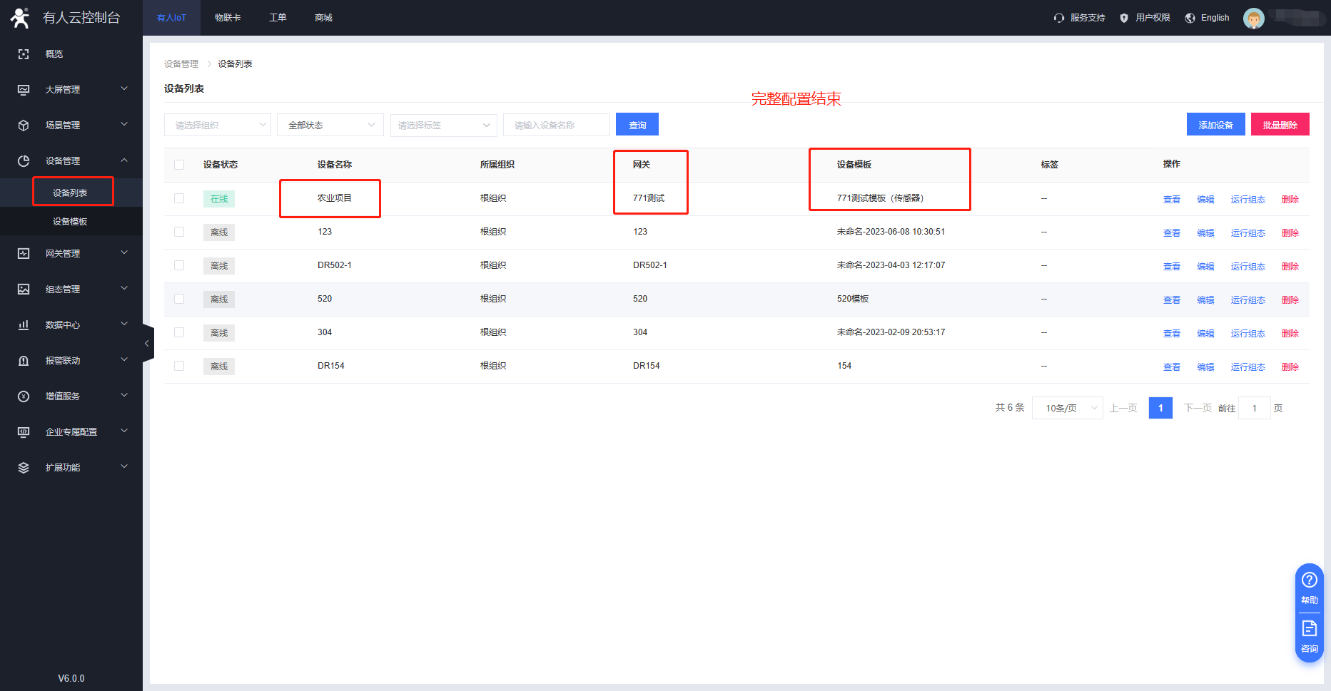 5、在設(shè)備列表信息展示界面,顯示關(guān)聯(lián)的網(wǎng)關(guān)與設(shè)備模板表示云端配置已完成