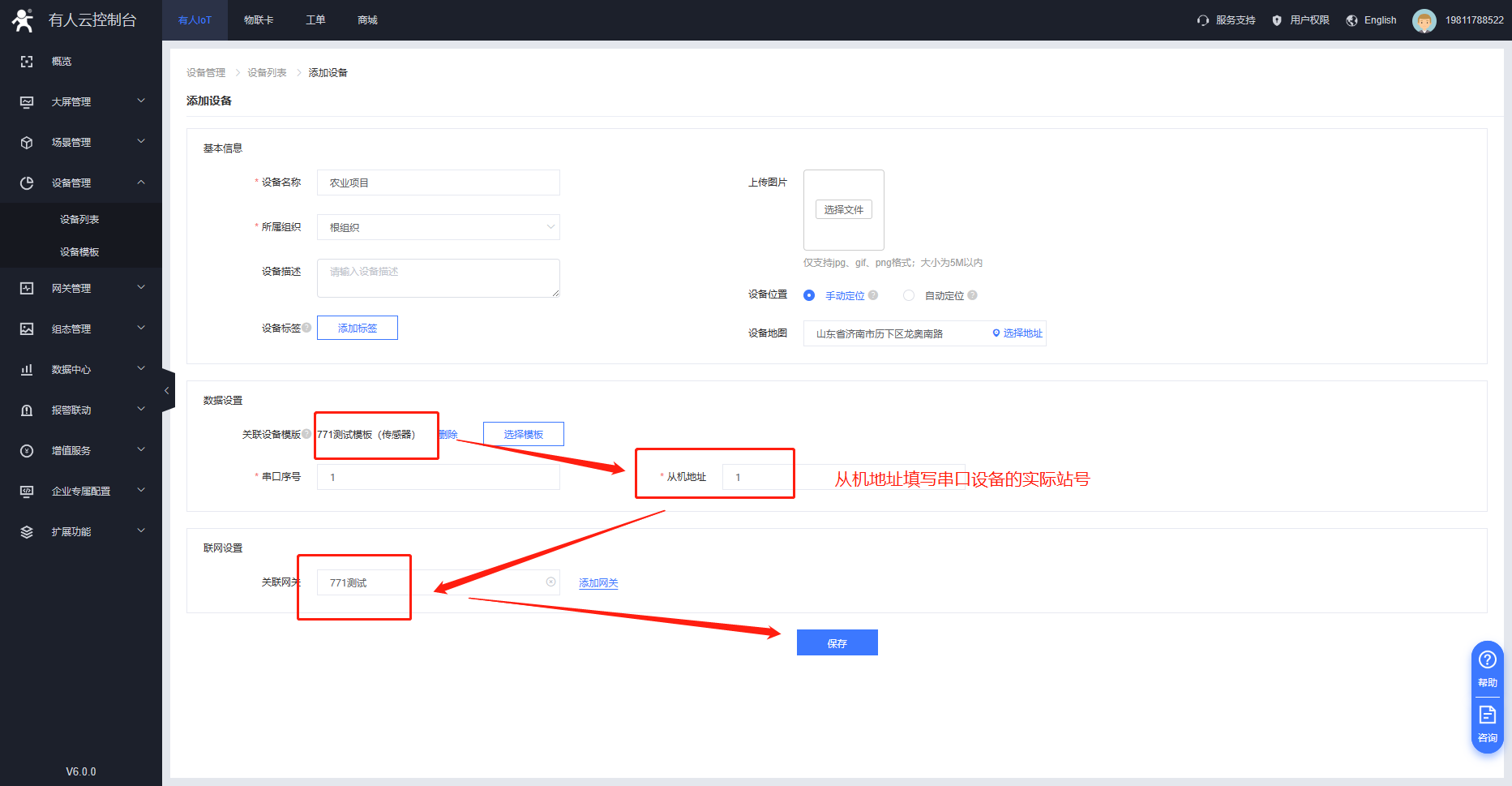 4、在設(shè)備管理--設(shè)備列表的界面將掃碼配置的網(wǎng)關(guān)以及設(shè)備模板進行關(guān)聯(lián),并配置串口終端設(shè)備的從機地址。