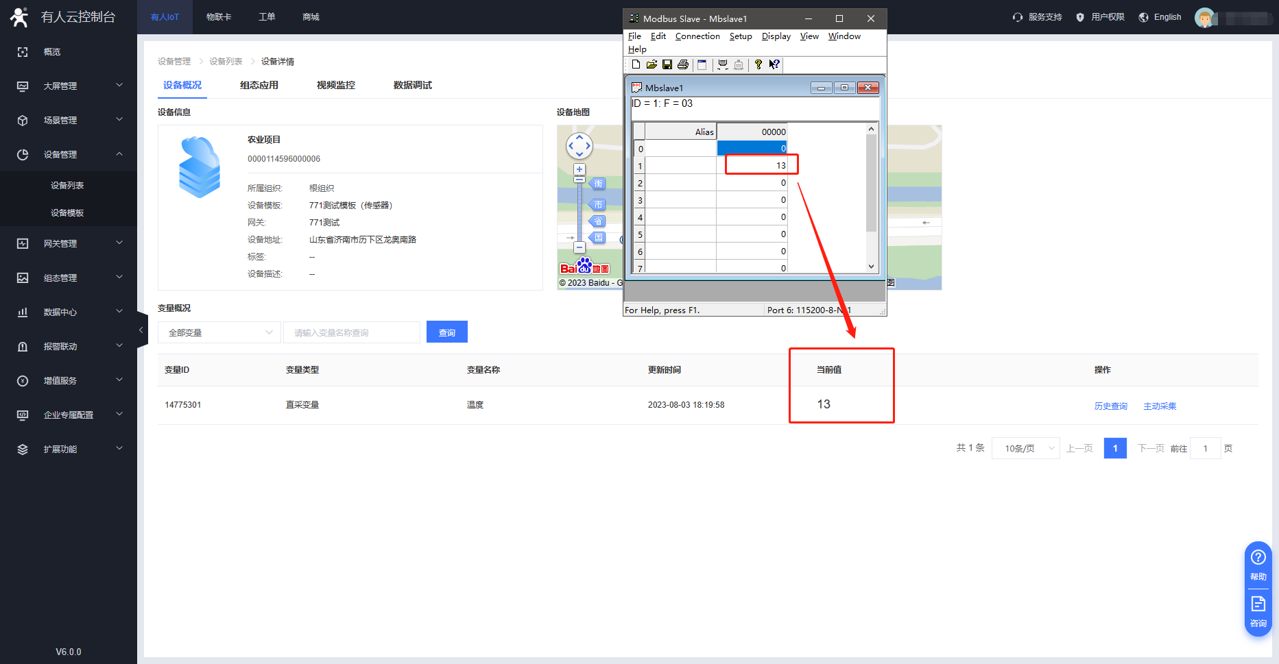 打開modbus slave軟件(模擬串口傳感器設(shè)備)配置串口設(shè)備的寄存器信息,調(diào)用電腦設(shè)備管理器中生成的端口。寄存器數(shù)值寫為13,云端將進行采集。