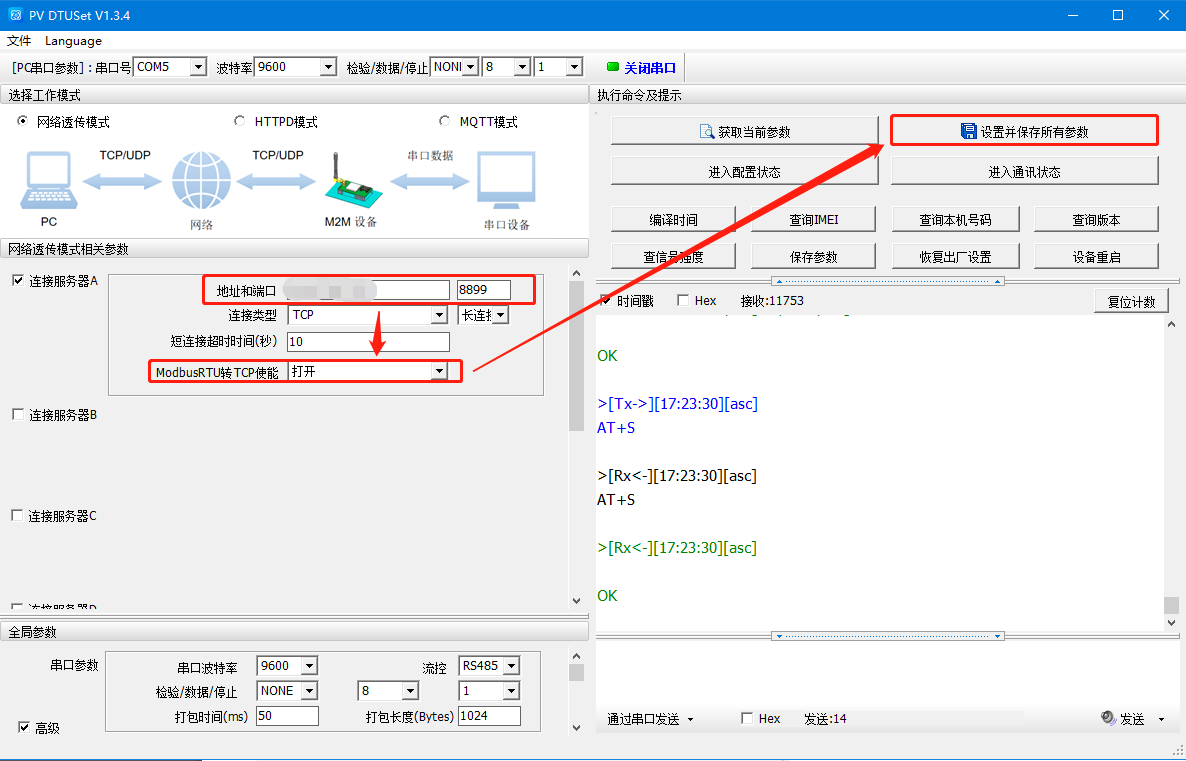 3.配置USR-S100連接遠程TCP服務器,將遠程服務器A參數(shù)修改為要連接服務器的IP和端口號,開啟modbus RTU轉(zhuǎn)modbus tcp使能功能,點擊設(shè)置并保存所有參數(shù)