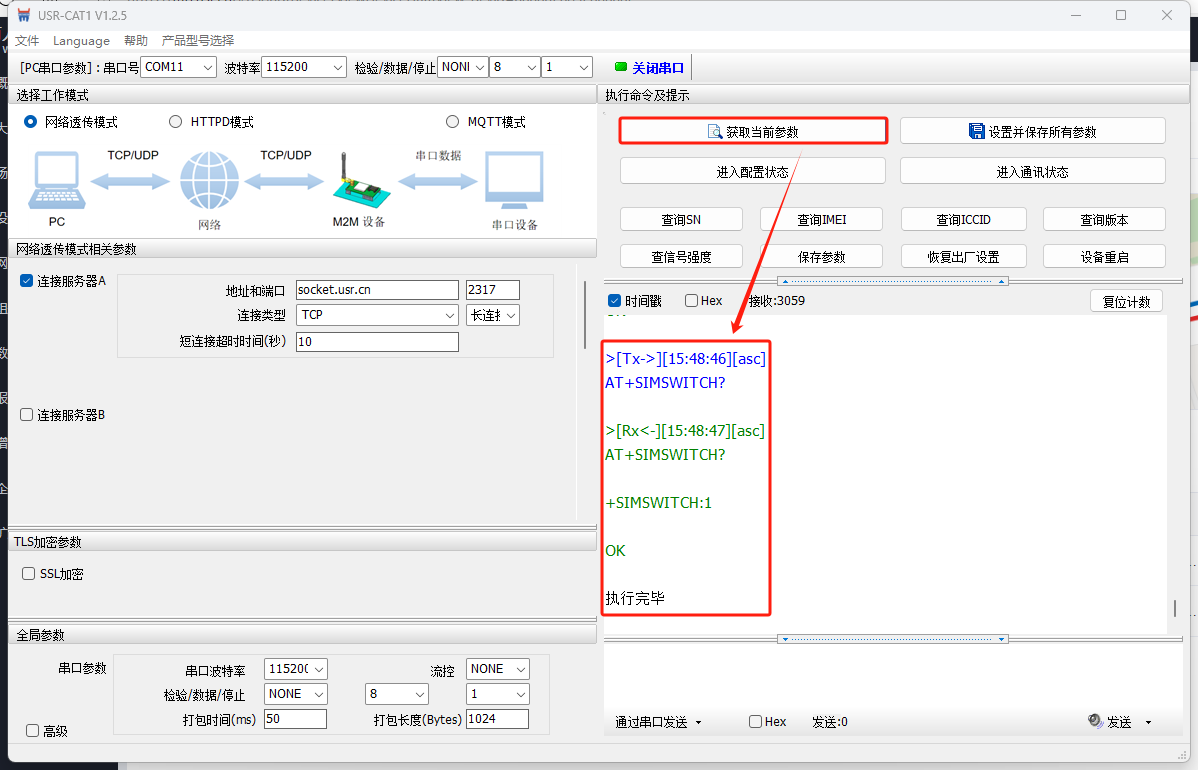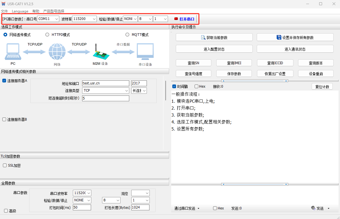 打開(kāi)WH-LTE-7S0上位機(jī)軟件,型號(hào)選擇WH-GM800TF-X-N41(同7S0 參數(shù)類(lèi)似) ,COM11,串口參數(shù)選擇115200 NONE 8 1,打開(kāi)串口。