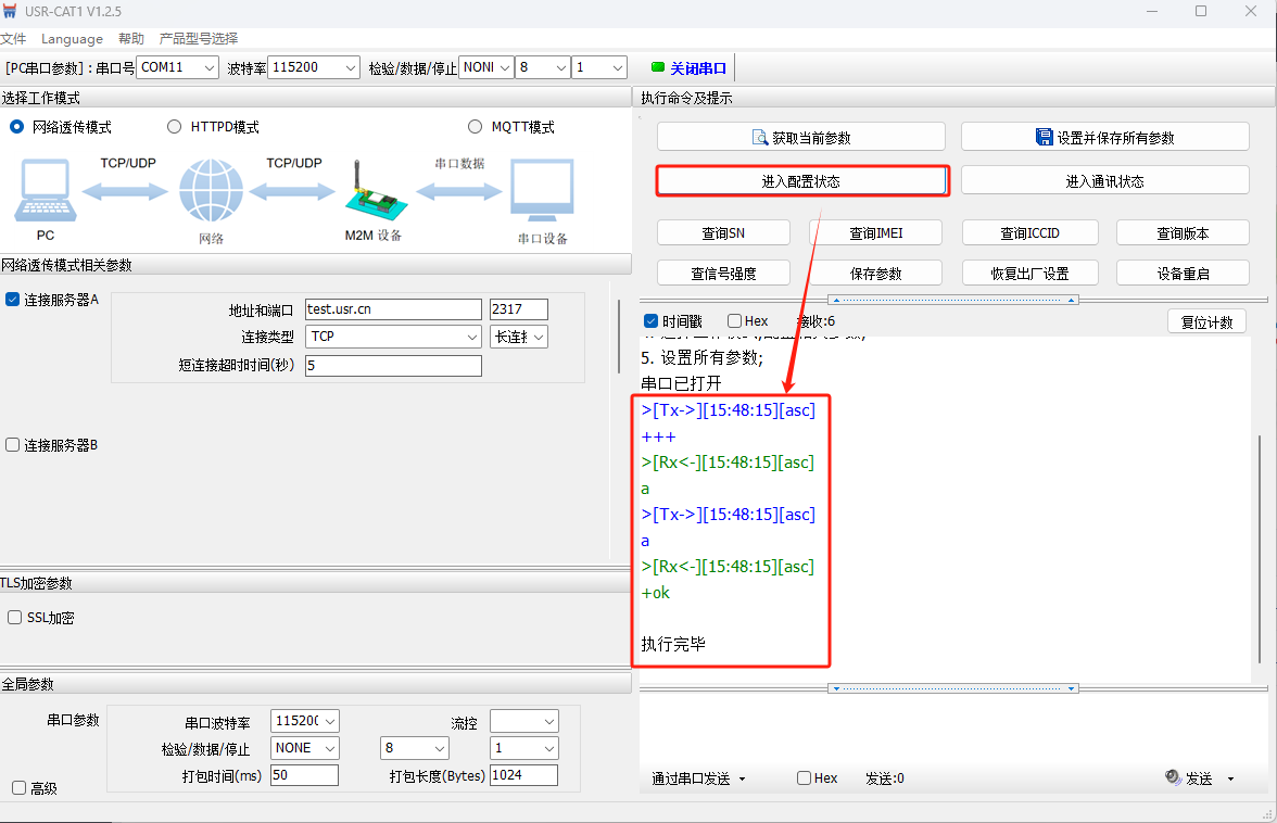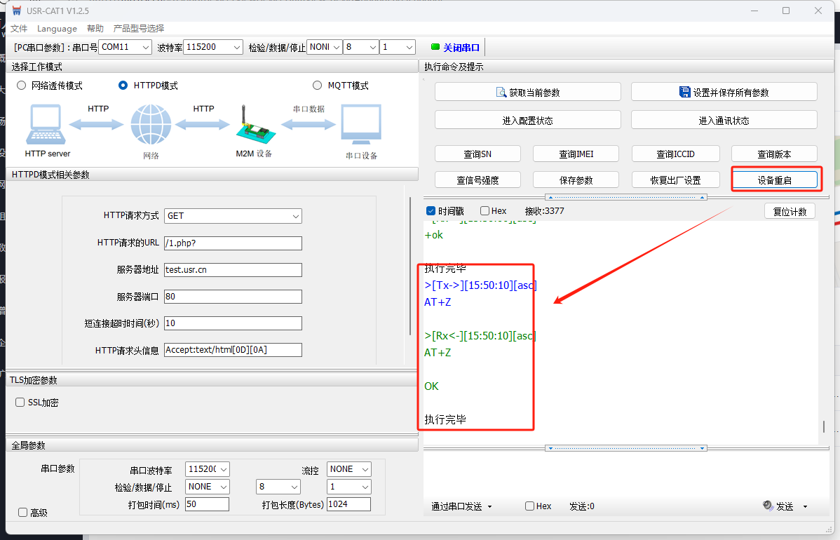 WH-LTE-7S0的底板232串口接USB-RS232串口線(xiàn)到電腦USB口,然后產(chǎn)品接12V電源適配器上電。本例使用有人測(cè)試服務(wù)器,測(cè)試服務(wù)器發(fā)什么數(shù)據(jù)回復(fù)什么數(shù)據(jù)