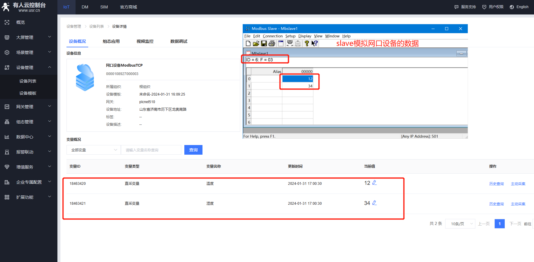 打開Modbus slave模擬網(wǎng)口TCP數(shù)據(jù),在有人云上可以顯示數(shù)據(jù)
