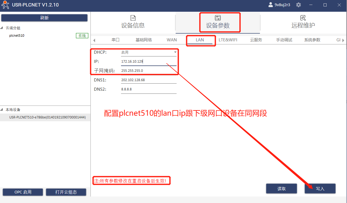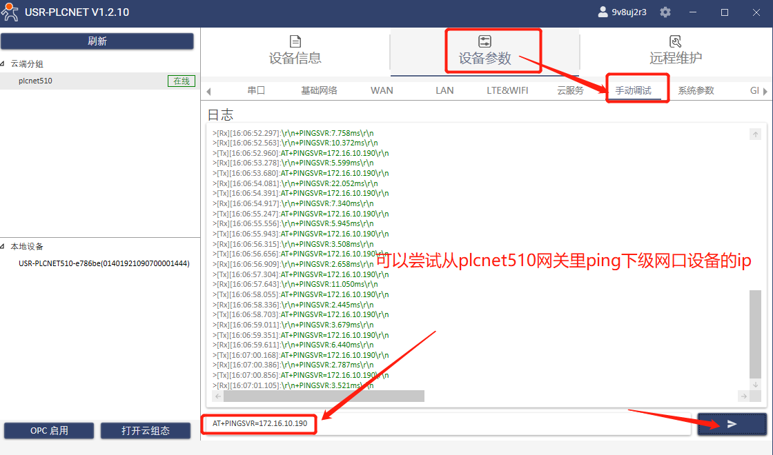 (2)打開“設(shè)備參數(shù)”---“LAN”---配置LAN口ip與下級設(shè)備在同網(wǎng)段,參數(shù)需要重啟才會生效。配置完參數(shù)后,可以在“手動調(diào)試”頁面ping一下下級設(shè)備的ip,ping通說明網(wǎng)絡(luò)連接正常。