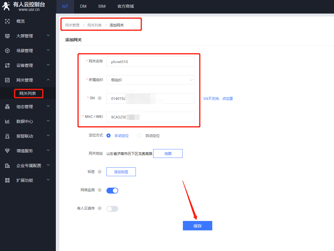 (1)登錄有人云賬號,點(diǎn)擊“網(wǎng)關(guān)管理”---“網(wǎng)關(guān)列表”---輸入PLCNET510背后的SN和MAC,點(diǎn)擊“保存”