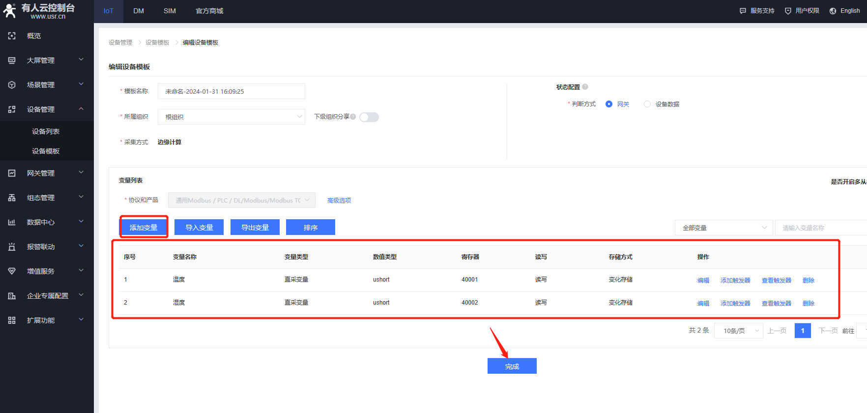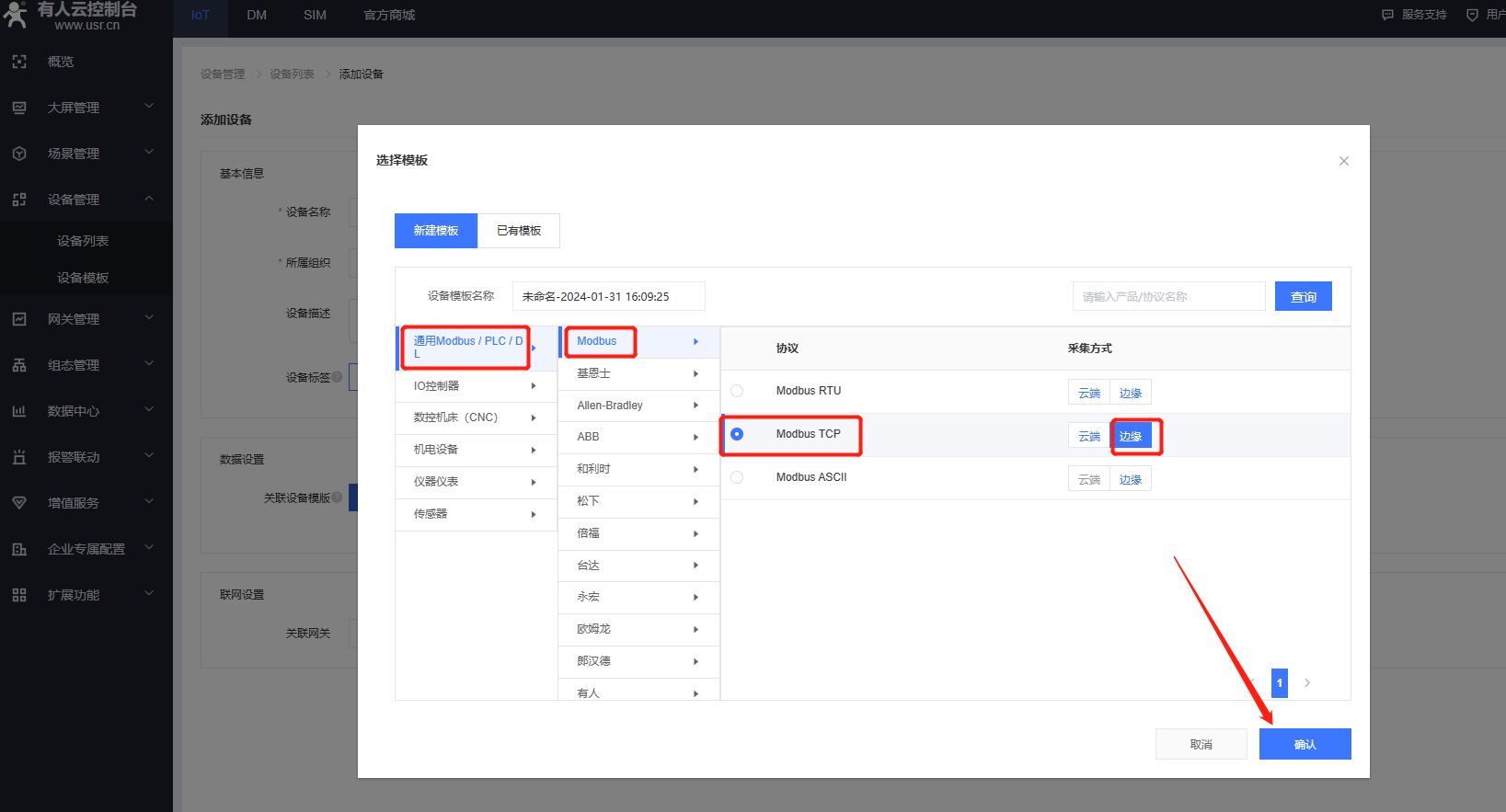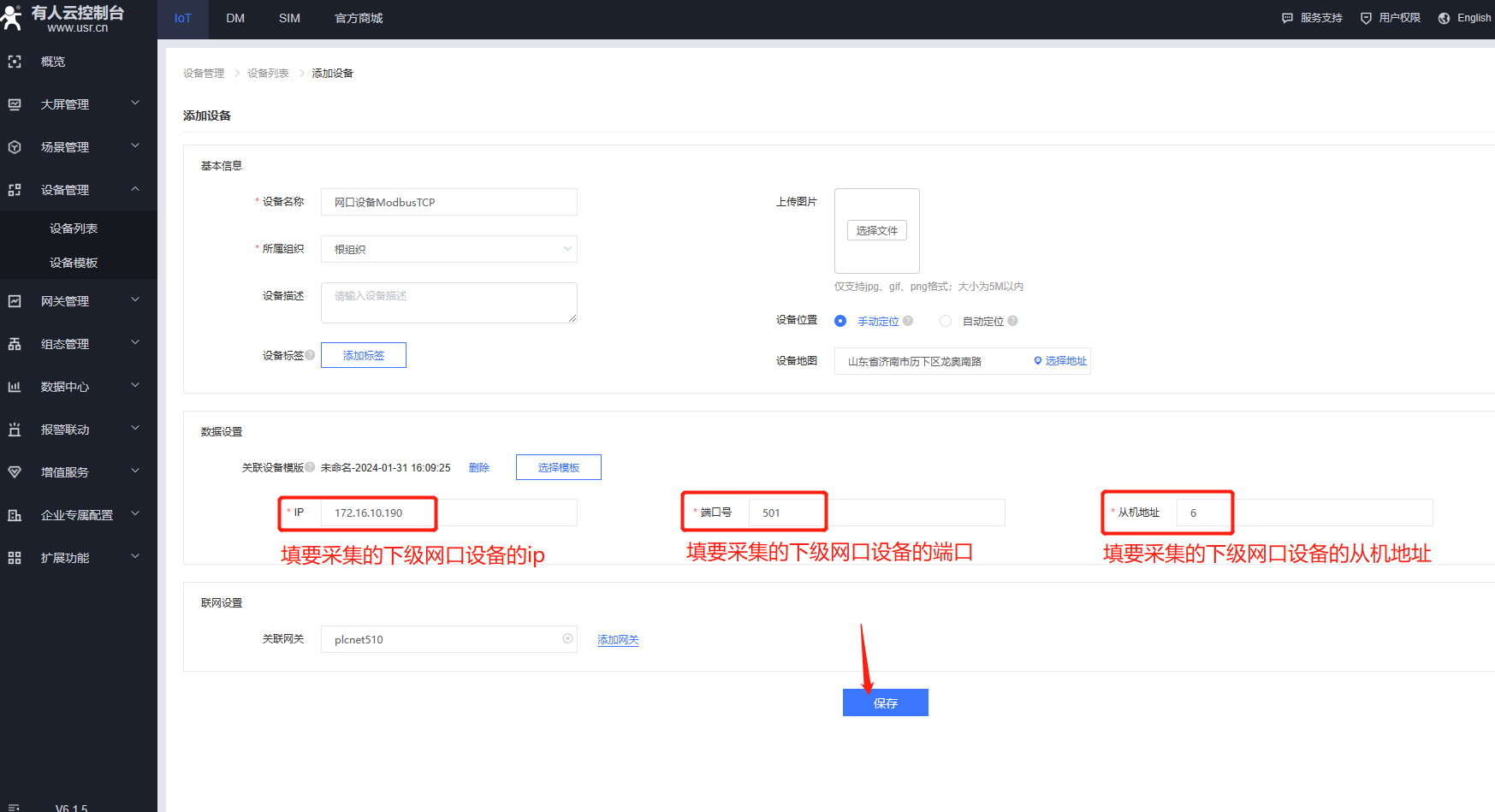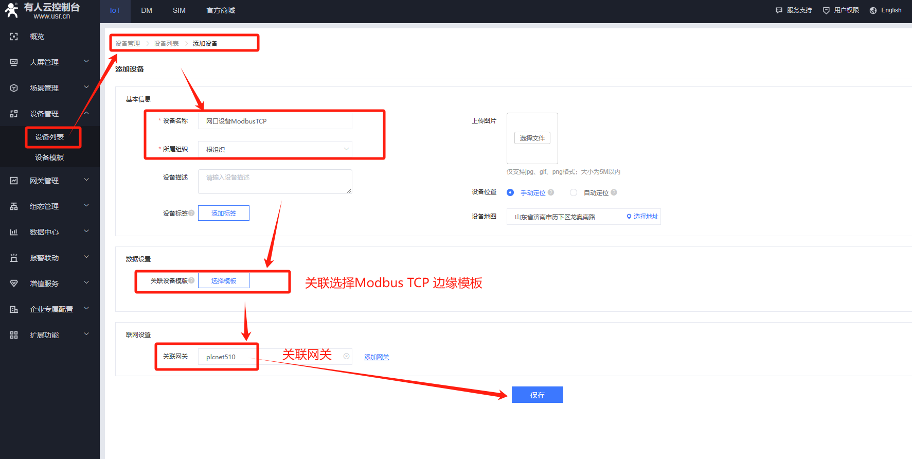 (3)點(diǎn)擊“設(shè)備管理”---“設(shè)備列表”---添加設(shè)備---關(guān)聯(lián)Modbus TCP模板和網(wǎng)關(guān)510