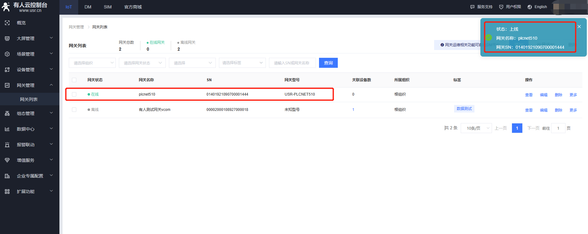 (2)PLCNET510的WAN口接在可以上外網(wǎng)的路由器上,可以發(fā)現(xiàn)網(wǎng)關(guān)510上線了