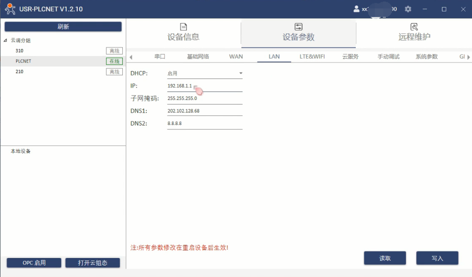 打開plcnet配置軟件,lan口ip配置與plc同網(wǎng)段但不能相同(如plc ip為192.168.1.11,plcnet設(shè)置為192.168.1.1),配置完成后右下角寫入?yún)?shù),重啟網(wǎng)關(guān)生效