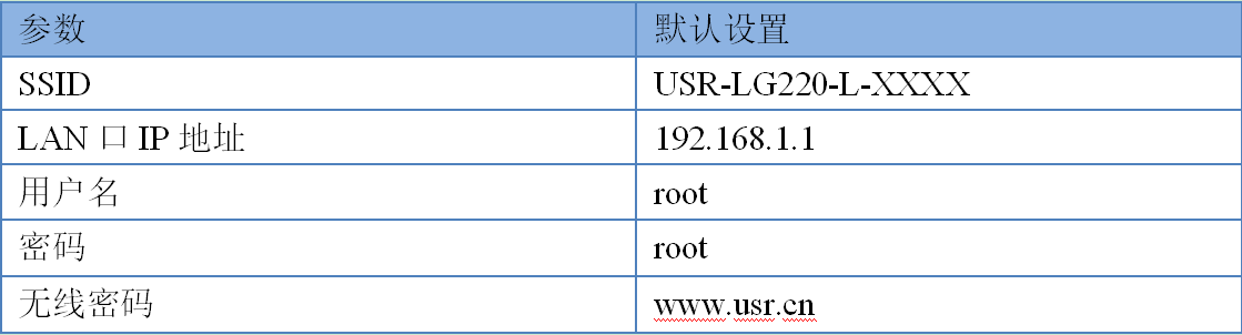 默認(rèn)情況下,USR-LG220-L的無(wú)線AP的默認(rèn)名稱為USR-LG220-L -xxxx,IP地址和用戶名、密碼如下: