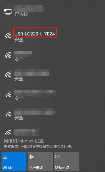 首先用PC的無(wú)線網(wǎng)卡,LG220的默認(rèn)SSID為USR-LG220-xxxx,操作電腦的無(wú)線網(wǎng)卡加入這個(gè)無(wú)線網(wǎng)絡(luò)。