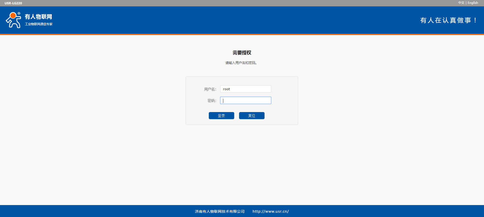 等無(wú)線連接好后,打開(kāi)瀏覽器,在地址欄輸入192.168.1.1回車。填入用戶名和密碼(均為root),然后點(diǎn)擊確認(rèn)登錄,網(wǎng)頁(yè)會(huì)出現(xiàn)USR-LG220-L的管理頁(yè)面,如下圖。