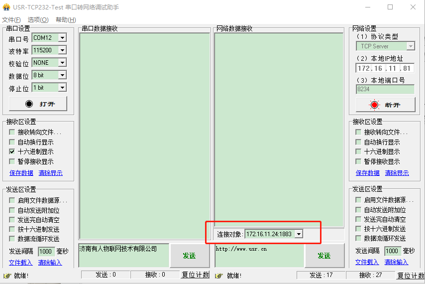 打開USR-TCP232-Test串口轉(zhuǎn)網(wǎng)絡(luò)調(diào)試助,下載地址http://www.xypctpk.cn/Download/27.html