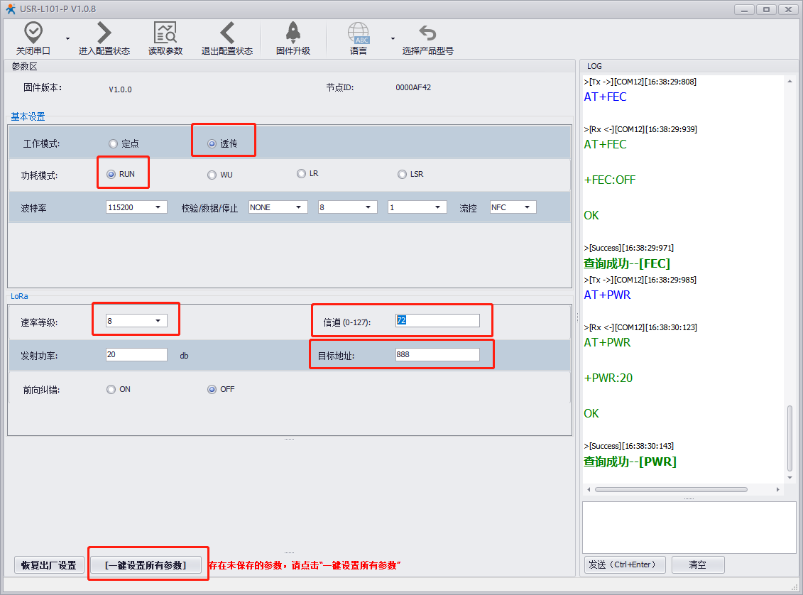 打開LoRa設(shè)置軟件(產(chǎn)品型號選擇L101-P),依次點擊打開串口(選擇A、B對應(yīng)的串口號,串口參數(shù):115200,None,8,1,NFC)、進入配置狀態(tài)、讀取參數(shù)、配置參數(shù)、一鍵設(shè)置所有參數(shù),關(guān)閉LoRa設(shè)置軟件。