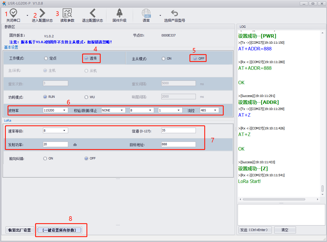 打開LoRa設置軟件(LG207和LG206-P選擇同一個),依次點擊打開串口(選擇A、B對應的串口號,串口參數(shù):115200,None,8,1,NFC)、進入配置狀態(tài)、讀取參數(shù)、配置上表中的參數(shù)、一鍵設置所有參數(shù),關閉LoRa設置軟件。