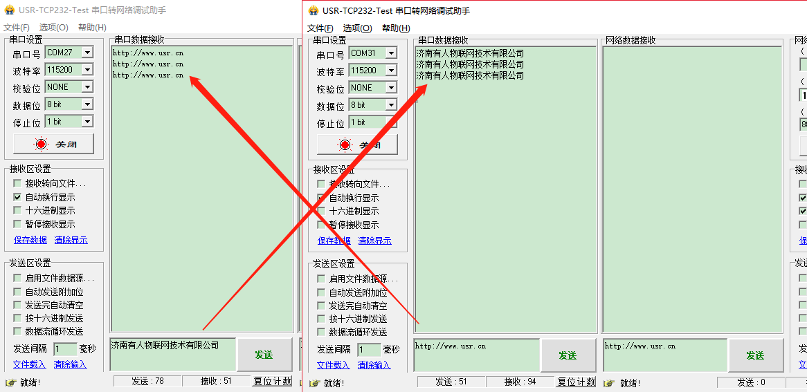 (3)啟動兩個USR-TCP232-Test(模擬串口設備1,2)分別連接LoRa數(shù)傳終端A、B的串口,使用串口設備1發(fā)送數(shù)據(jù)串口設備2可接收數(shù)據(jù)(反之亦然),通信效果如下圖所示: