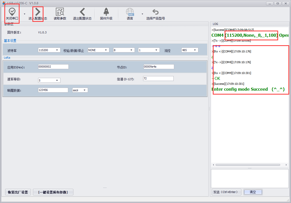 1、打開(kāi)串口,進(jìn)入配置狀態(tài),206-L-C默認(rèn)參數(shù):115200,N,8,1