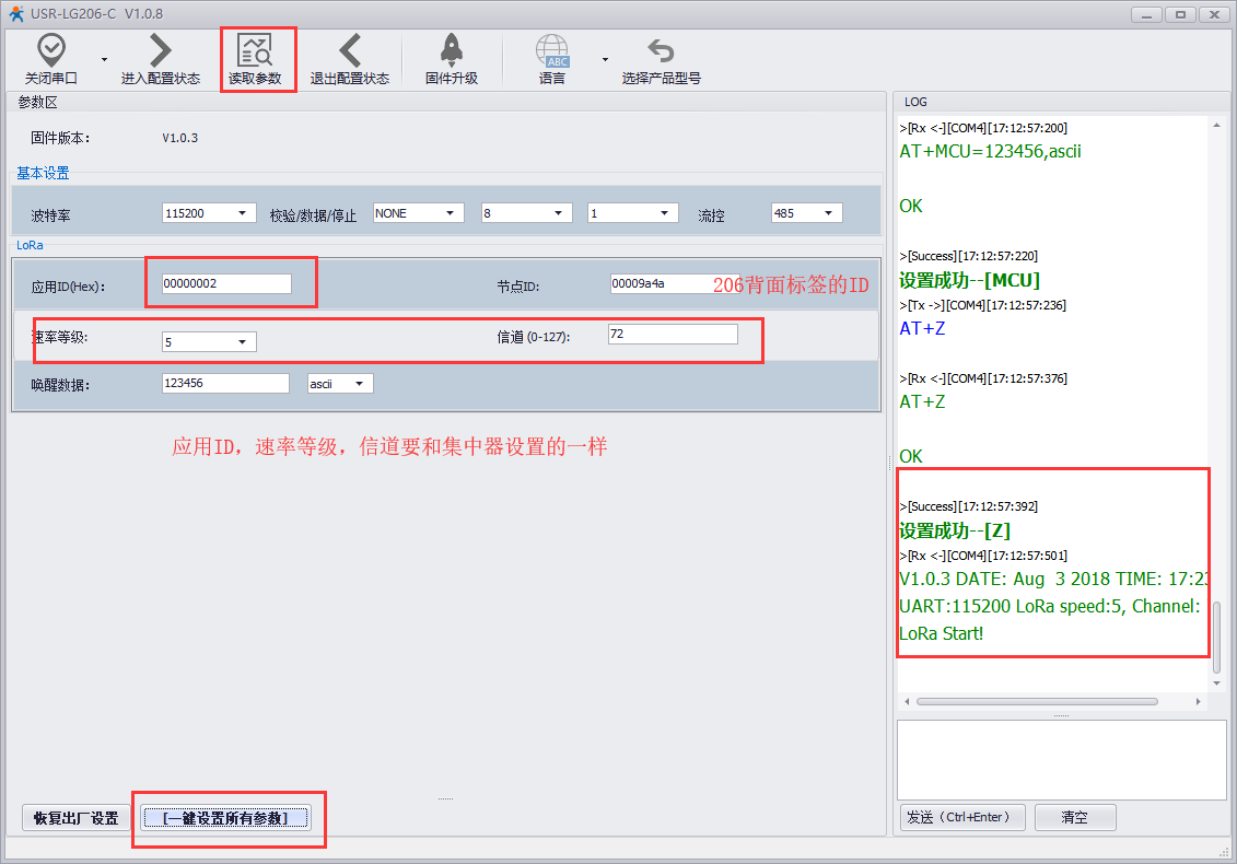 2、點(diǎn)擊讀取參數(shù),設(shè)置參數(shù),保證應(yīng)用ID(可設(shè)),速率等級(jí),信道要和集中器一樣,節(jié)點(diǎn)ID在206背面的標(biāo)簽上。設(shè)置完成后一定不要忘一鍵設(shè)置所有參數(shù)。