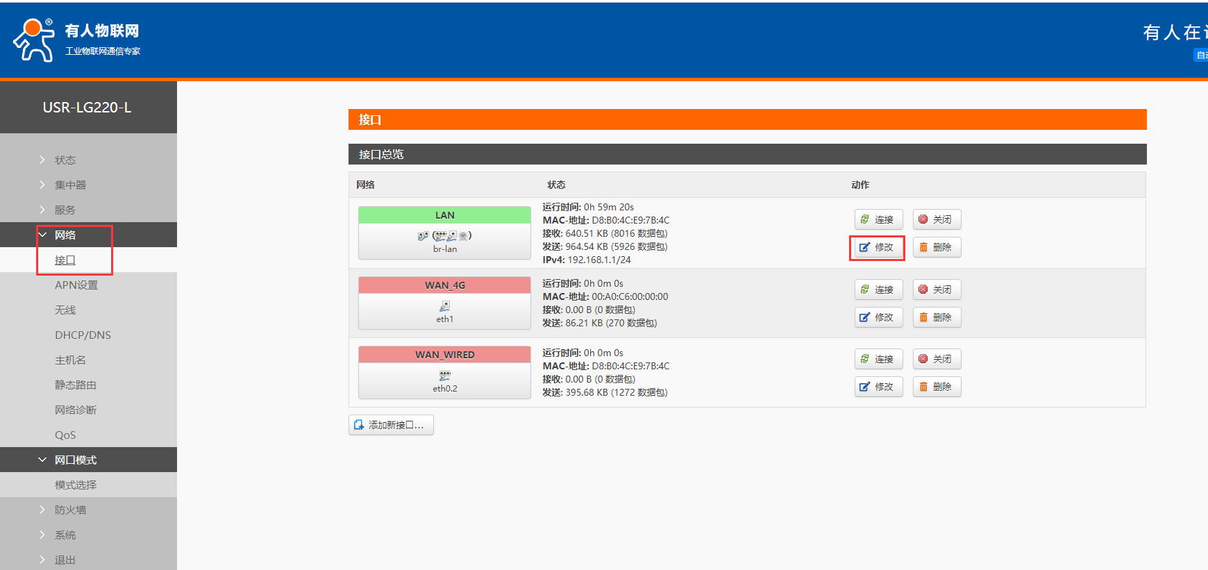 4、如果需要修改IP地址在網(wǎng)絡(luò)接口,LAN位置進(jìn)行修改