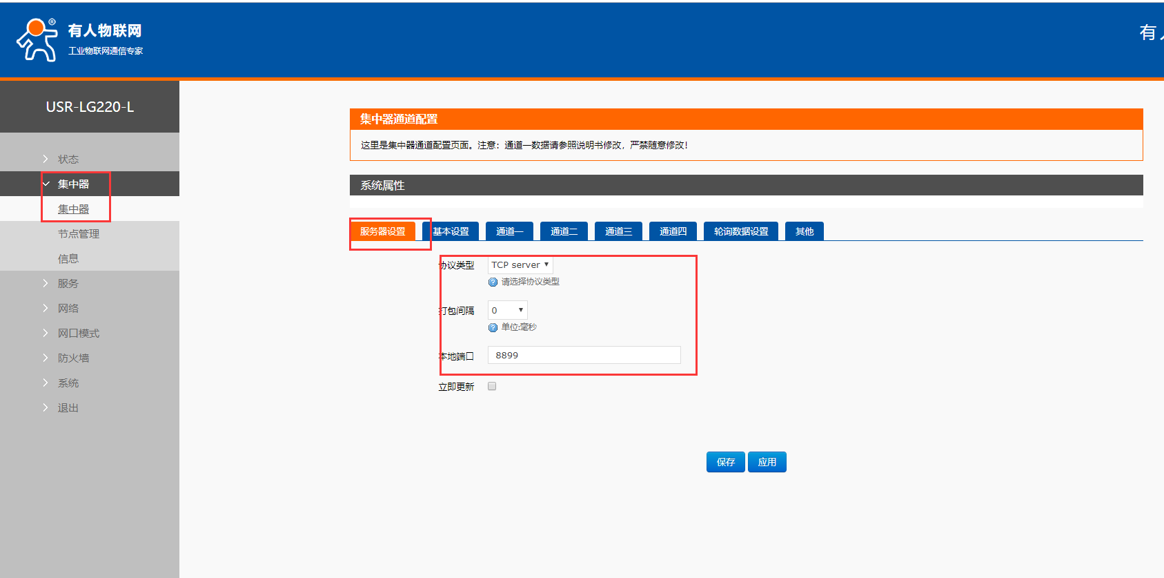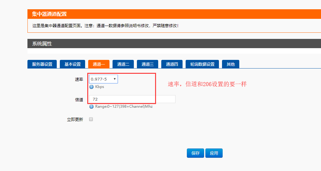 7、設(shè)置集中器的信道和速率,依次點(diǎn)擊集中器,通道一設(shè)置速率和信道和lora相同,點(diǎn)擊保存應(yīng)用,通道二、三、四中設(shè)置的速率與信道各不相同,且都與通道一不同。