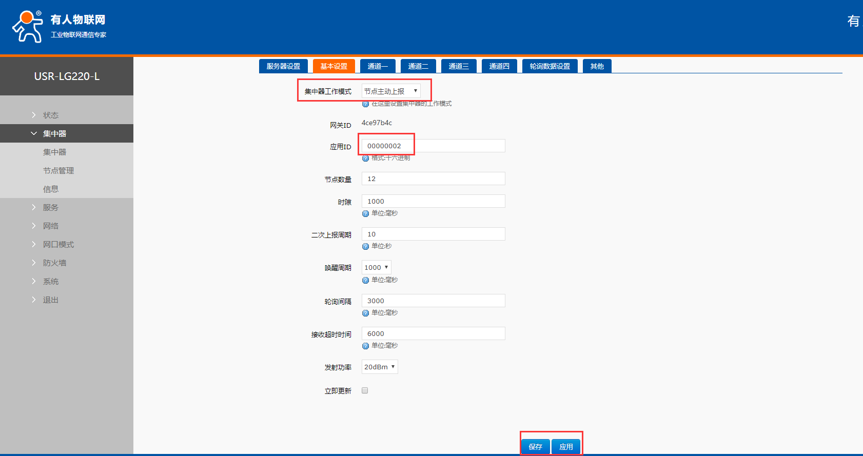 6、設(shè)置集中器的應(yīng)用ID,依次點(diǎn)擊集中器,基本設(shè)置,應(yīng)用ID(206設(shè)置的應(yīng)用ID),設(shè)置應(yīng)用ID和lora相同。最后保存應(yīng)用。工作模式以節(jié)點(diǎn)主動(dòng)上報(bào)為例。