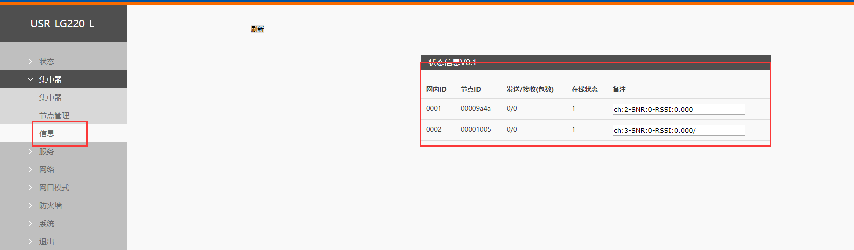 9、重啟完畢登陸集中器在集中器—信息 可參看加入的節(jié)點(diǎn)信息,串口助手會(huì)顯示連接對(duì)象ip與端口號(hào)。