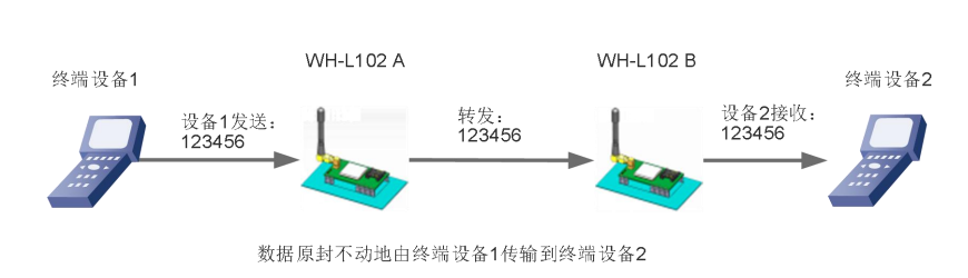 (3)啟動兩個USR-TCP232-Test(模擬串口設(shè)備1,2)分別連接LoRa數(shù)傳終端A、B的串口,使用串口設(shè)備1發(fā)送數(shù)據(jù)串口設(shè)備2可接收數(shù)據(jù)(反之亦然),通信效果如下圖所示:
