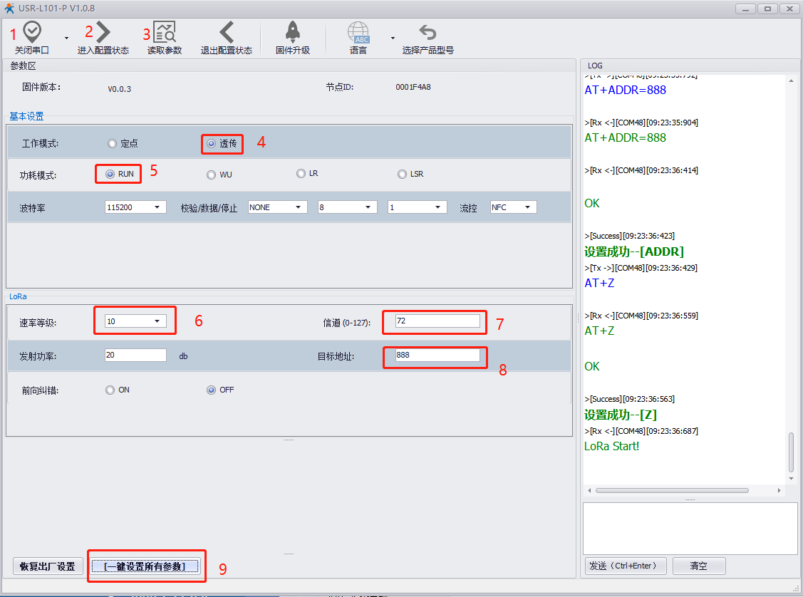 打開LoRa設(shè)置軟件(102-P設(shè)備選擇L101-P打開軟件),依次點擊打開串口(選擇A、B對應(yīng)的串口號,串口參數(shù):115200,None,8,1,NFC)、進入配置狀態(tài)、讀取參數(shù)、配置上表中的參數(shù)、一鍵設(shè)置所有參數(shù),關(guān)閉LoRa設(shè)置軟件。
