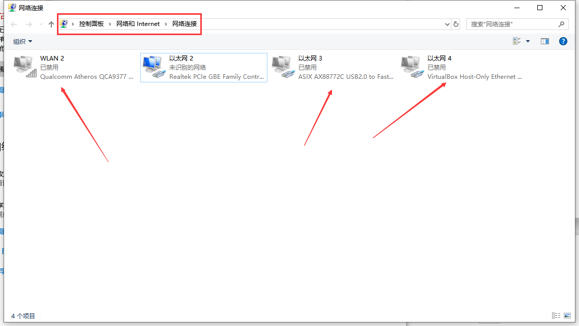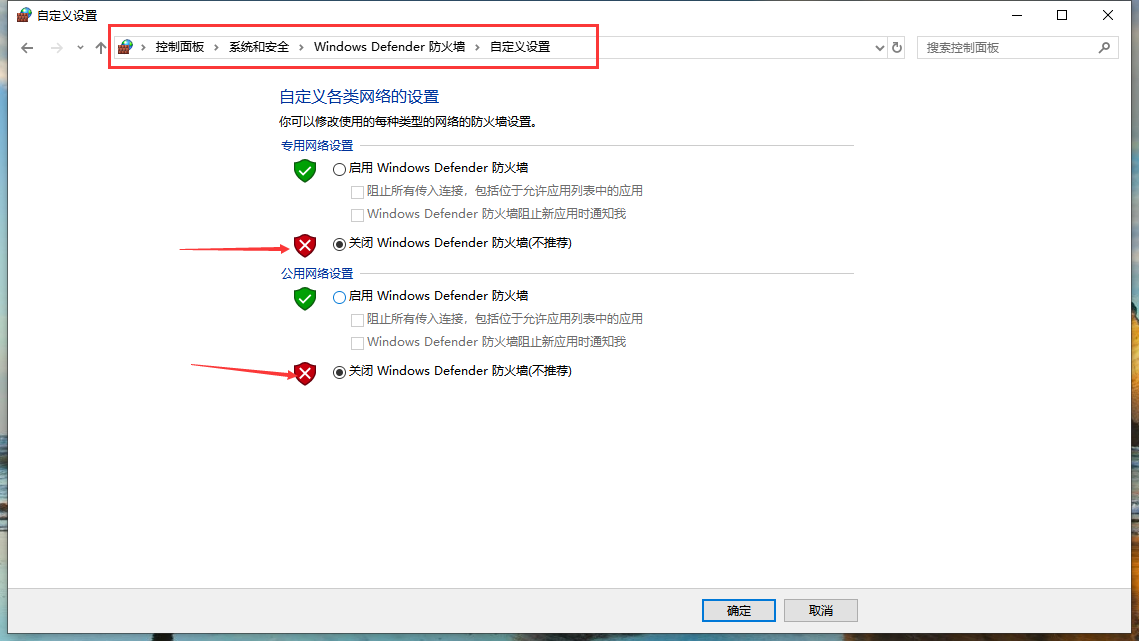 2、按路徑:控制面板--->網(wǎng)絡和Internet--->網(wǎng)絡和共享中心找到“windows防火墻”和“更改適配器設置”選項,關(guān)閉防火墻并禁用與本次測試無關(guān)的網(wǎng)卡。并關(guān)閉電腦殺毒軟件。