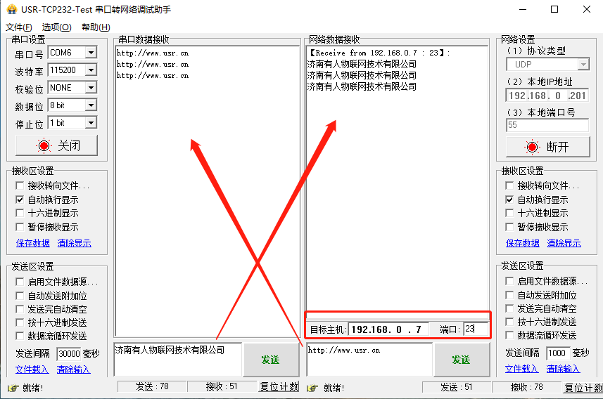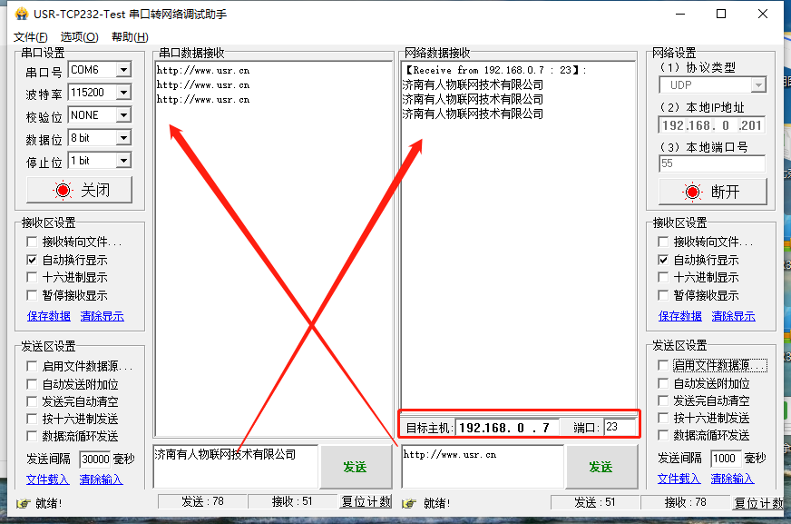 點擊“連接”后,需要將目標主機和端口改為301的Ip和本地端口,然后串口往網(wǎng)絡發(fā)一包數(shù)據(jù)建立連接后,網(wǎng)絡即可往串口發(fā)數(shù)據(jù)。