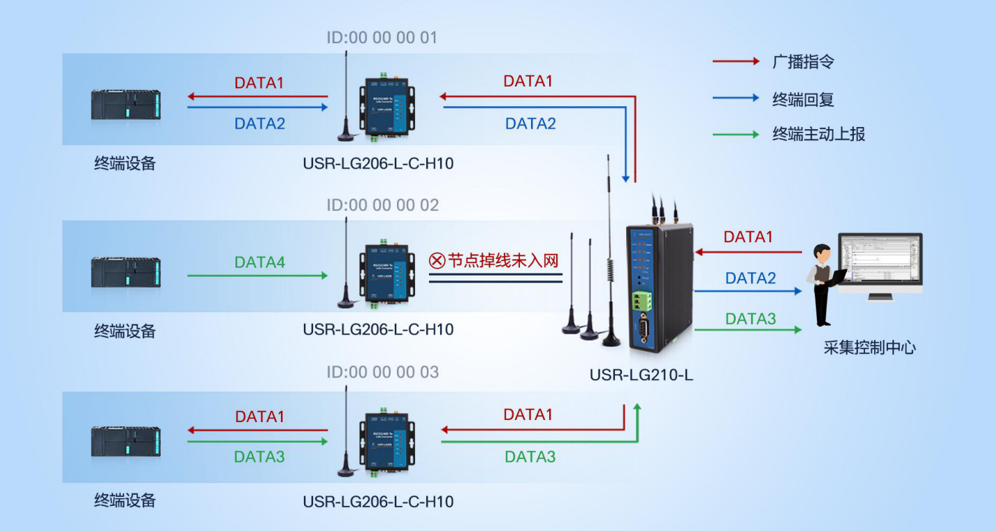 lora無線網(wǎng)關(guān)LG210與lora節(jié)點(USR-LG206-L-C-H10)安裝天線,使用各自配套電源適配器供電, LG210與LG206串口連接電腦,LG210網(wǎng)口連接路由器或者交換機,電腦也接入該路由器或交換機。