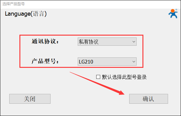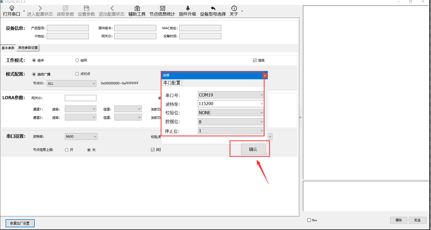 2) 打開設(shè)置軟件(協(xié)議選擇私有協(xié)議,型號選擇LG210),依次點擊打開串口(選擇LG210對應(yīng)的串口號,串口參數(shù):115200,None,8,1,NFC)。
