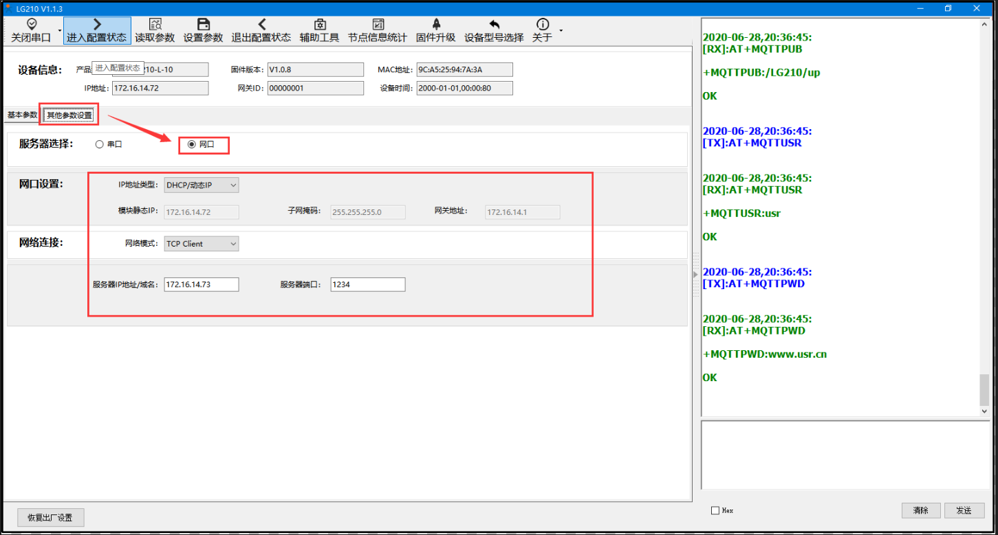 點擊“其他參數(shù)配置”,服務(wù)器選擇:“網(wǎng)口”。