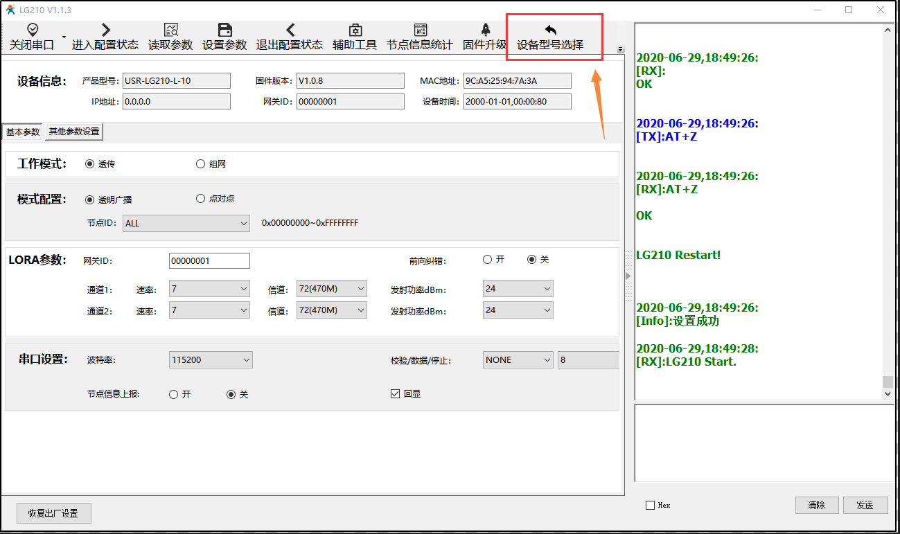 7) 配置LORA節(jié)點USR-LG206-L-C-H10,設(shè)置軟件設(shè)備選型選擇”LG206-L-p-H10”。