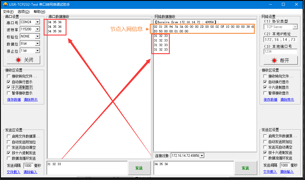 在USR-TCp232-Test軟件的串口端打開206的串口, 互發(fā)數(shù)據(jù)便可通信了。