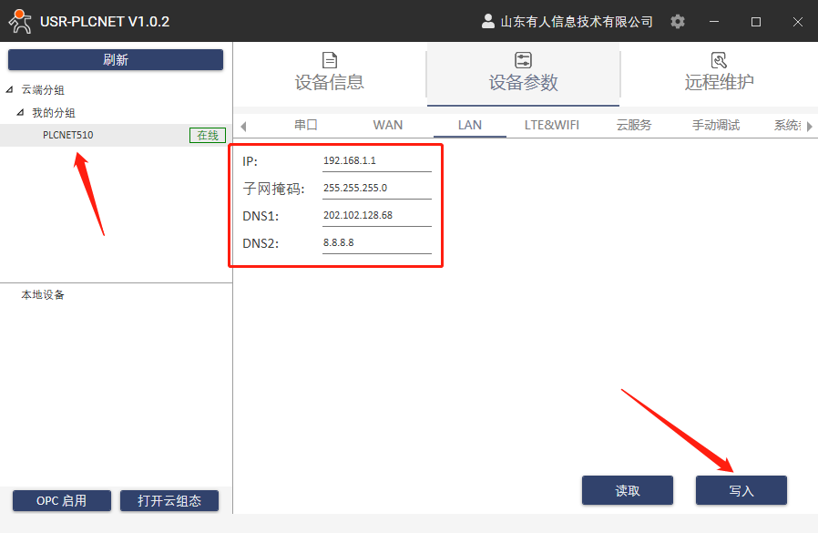 9.選中在線設(shè)備,設(shè)備參數(shù)》LAN,修改LAN口IP和PLC的網(wǎng)口IP在同一網(wǎng)段,點(diǎn)擊寫入