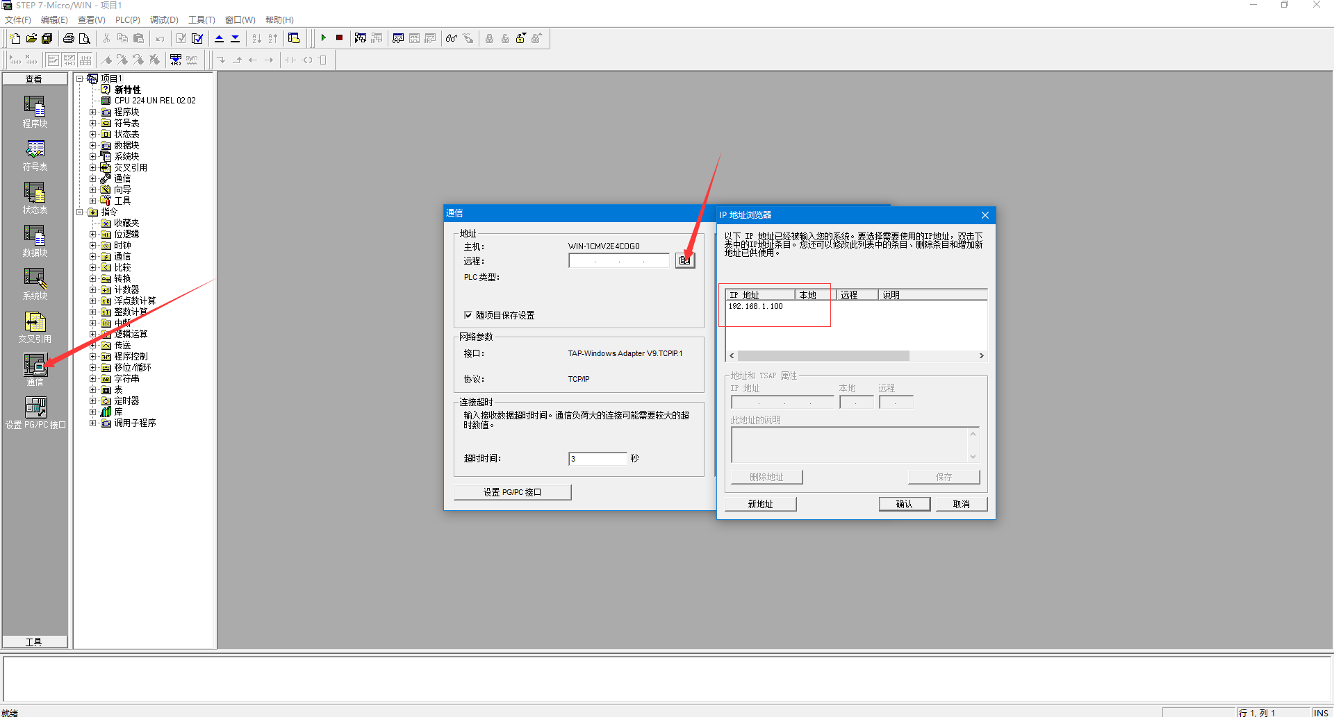 13.點(diǎn)擊通信,輸入PLC100的IP,雙擊刷新,選中刷新出的PLC